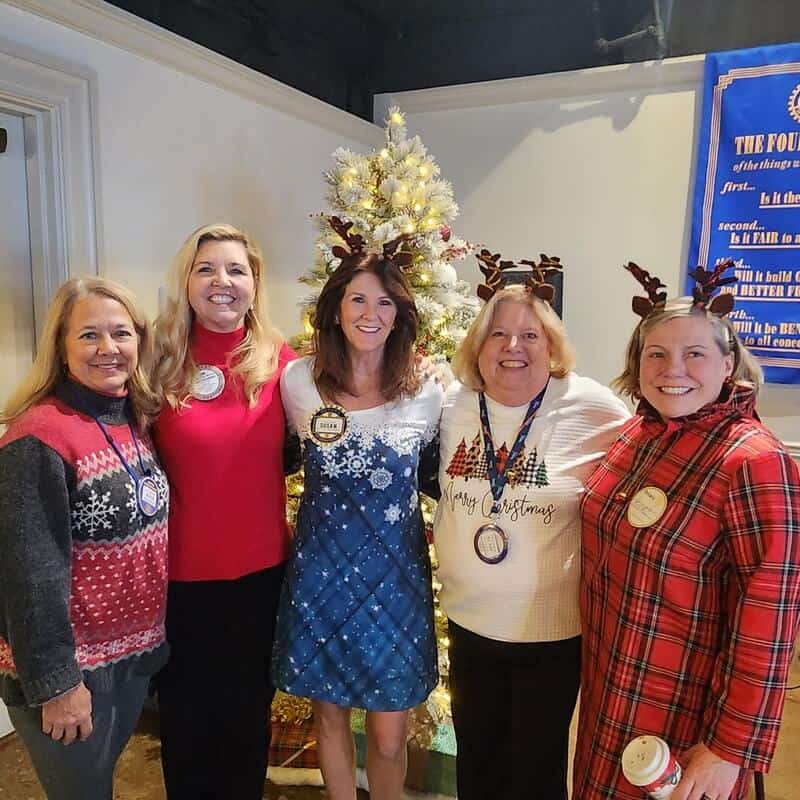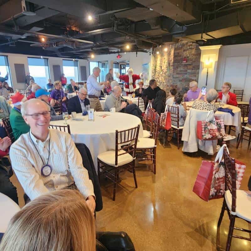 Before Santa, played wonderfully and enthusiastically by Rotarian Wynn Stephens, arrived to conclude the program, President Jim Richardson concluded his last meeting as interim president, and thanked everyone for giving him the opportunity to reconnect with the Club. He originally served as President in 2000-01. Jim noted that the past three months have been very rewarding and that he experienced the “Apex of Humanity.” As his last official duty, he gave the oath of office to Bill Wilson, who will serve as interim president from January to March, 2026. Ex-president Jim then got Rotarians, guests, and students into the Holiday Spirit– as if they weren’t already – by singing such songs as Rudolph the Red-nosed Reindeer, Let it Snow, and Santa Claus is Coming to Town. Enter Rotarian Santa Wynn and the fun began in earnest with each child receiving two gifts that were coordinated by our beloved Resource Officer at Booker T. Washington, Monica Hall. Good food and good fun was had celebrating the Holiday Season with deserving students – the Apex of Humanity indeed.